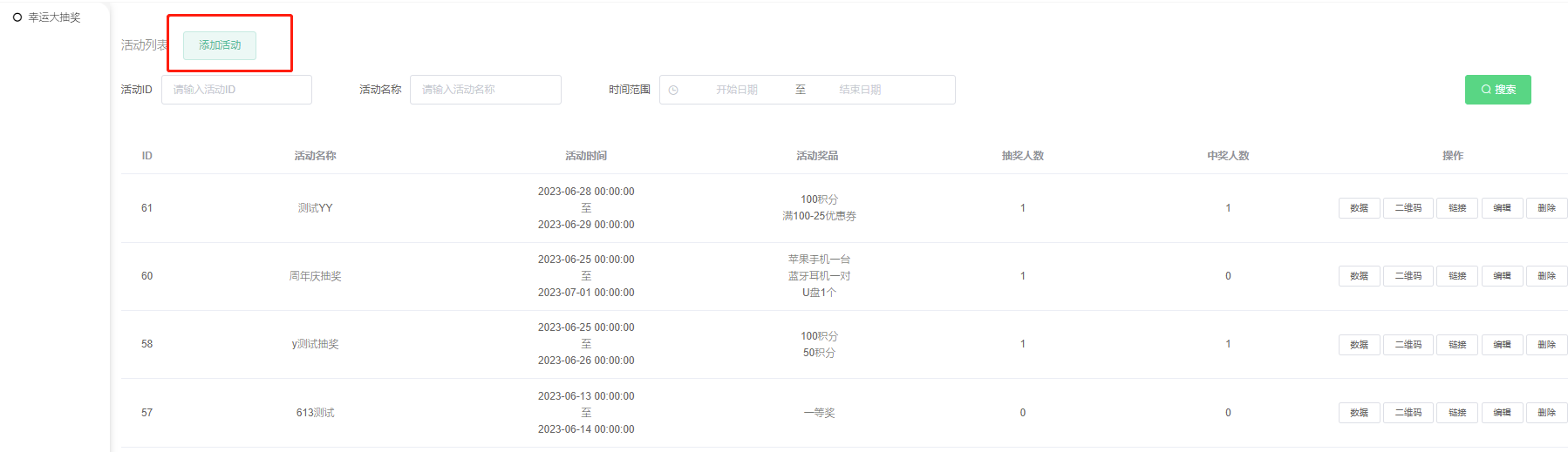 抽奖成功后可在后台活动列表—数据处查看获奖数据【只显示获奖的数据,未获奖数据不显示】