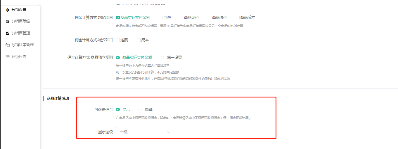 佣金信息,订单获得的佣金状态,分销等级和比例设置开启关闭效果如下