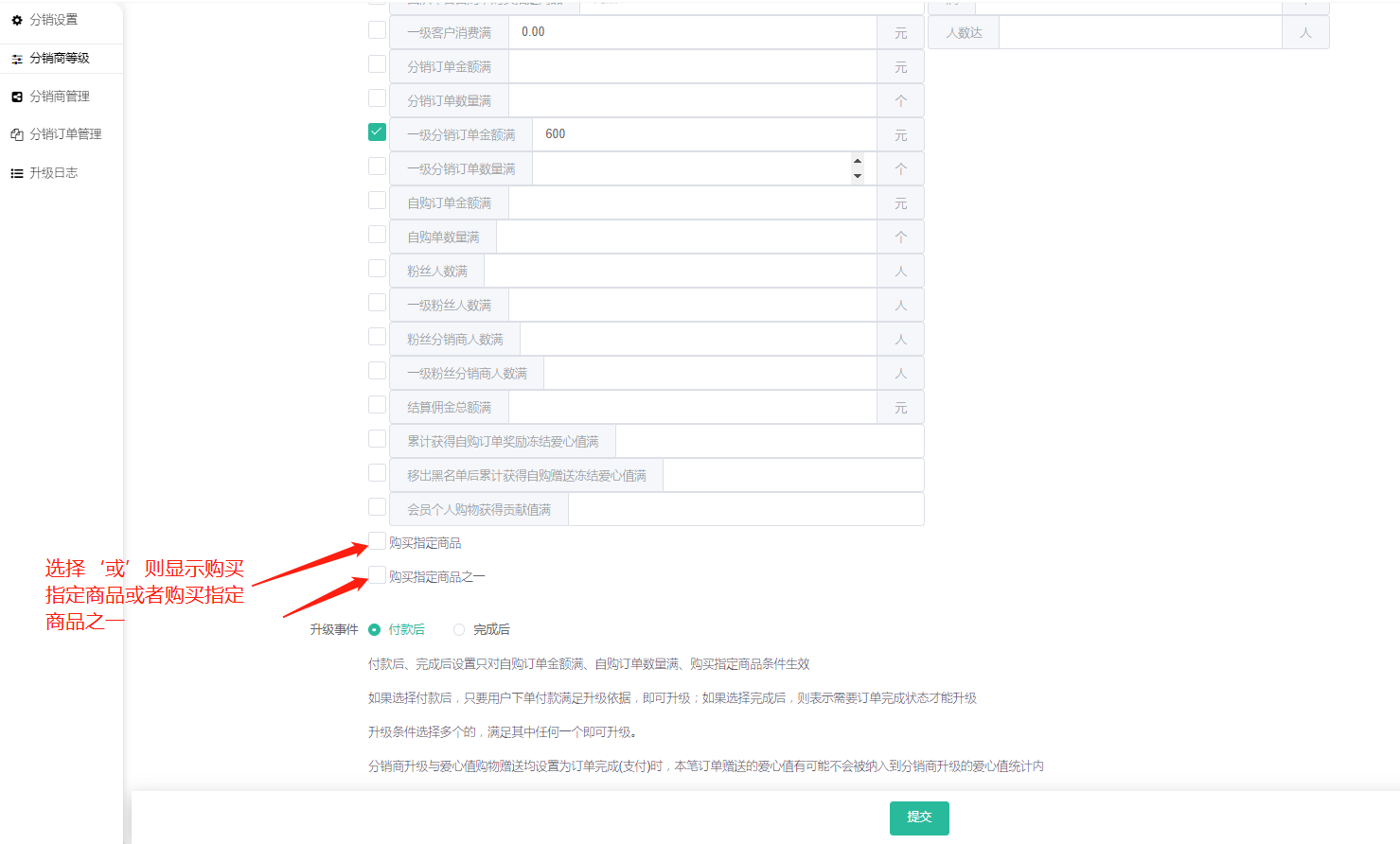 当分销设置--等级升级设置选择:与的时候